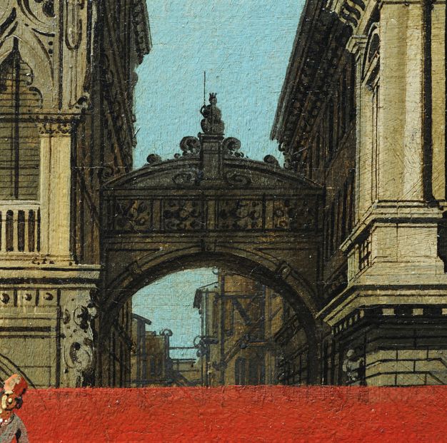 Canaletto’s application of a light imprimatura reflects his preference for painting applied shadows. Rather than leaving the dark red ground exposed or glazing over it to create shadows, the artist preferred to mix the colour of shadows and apply them in distinct shapes (fig. 21).53 The light imprimatura over the warm red Venetian ground created a midtone surface that allowed Canaletto to paint in this way.