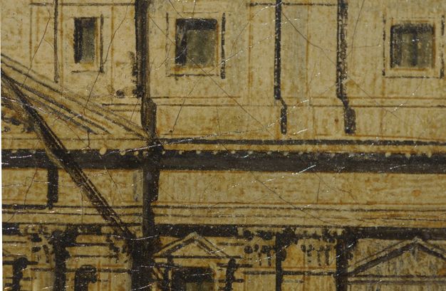 The refining process of incising and outlining transformed the rough blocks of colour into elaborately designed architectural spaces. Edges of forms and details of the architecture were established using incision lines that were scratched into the blocking-in layer while the paint was still wet (fig. 23). Outlining in black paint, often following a straight edge, was applied to emphasize architectural details. Incision lines provided a guide for the outlining of circles and arches, and decorative details were even scratched freehand into the paint. Sometimes, a softer grey paint was used in the distance to articulate receding space (fig. 22). The contrasting use of black and grey outlining can be seen in a detail from The Molo from the Bacino di San Marco on Ascension Day, with the Bucintoro (fig. 24), now in the collection of the Philadelphia Museum of Art.