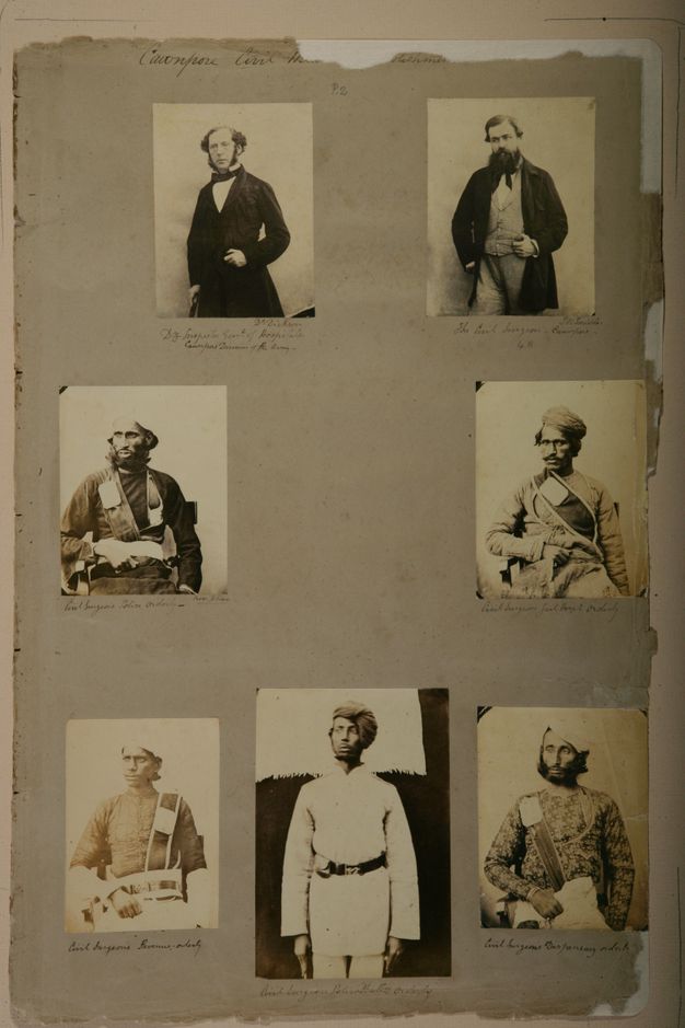 However, the rehabilitation of British domesticity is just one element of a much more ambitious photographic project: the virtual reconstruction of Anglo-Indian society. This project is made particularly explicit in the paired scenes of the war-ravaged Cawnpore church undergoing architectural reconstruction (fig. 9), but it also weaves its way through the assemblages of portraits that work to flesh out the local operations of a colonial state that had so recently been confronted with dissolution. The second page of the album (fig. 10) supplements Tresidder’s initial identification of himself as a husband with a portrait of him on the top right-hand side of the page that is captioned according to his public role, “J. N. Tresidder The Civil Surgeon—Cawnpore.” This professional persona is situated within a series of similar portraits that constitute the district’s medical network, most notably the Deputy Inspector General of Hospitals, Dr Dickson (whose pose is identical to Tresidder’s), as well as numerous Indian medical staff, including civil surgeon orderlies for the police and the hospital on the same page as Tresidder, and assistant surgeons and doctors on the following page.