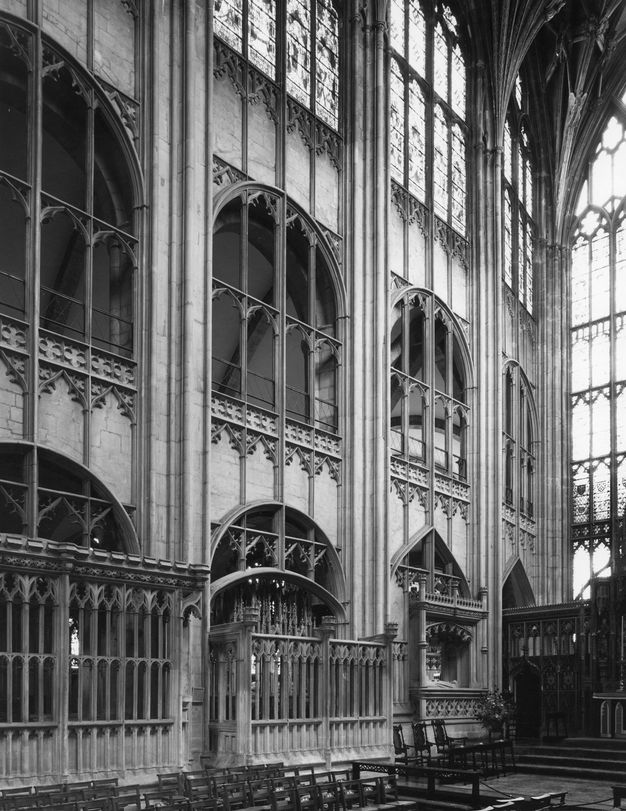 As at Canterbury a hundred and fifty years before, the eventual solution was a compromise, an integration of old and new. While the tracery veneers at Gloucester looked sleek and fashionable, the retention of round arches provides an acknowledgement of the Norman past. The clothing of the ancient elevation was one audacious stroke amongst many. At the east end of the church, the original apse was replaced with a mighty window, in effect “a monumental hieratic reredos in glass”.25 A further tour de force was the insertion of freestanding ogee arches at the crossing to provide a support for the lierne vault—the so-called “coat-hangers” (fig. 8). Even in a design admired for its harmony and consistency, the eventual appearance of the choir was surely the result of a process, rather than an inspired vision conceived by the architect at the start. The scheme was in fact based on what was effectively a trial run in the south transept. In all this we can only speculate about the respective contributions of the master mason, the abbot, and the community (and perhaps the crown).