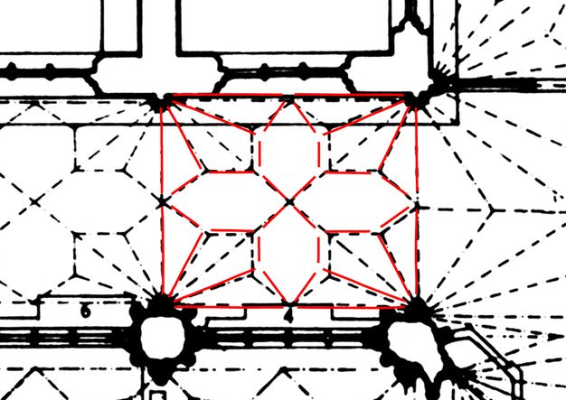The position of the junction of the liernes and longitudinal tiercerons seems to have been determined by the addition to the plan of four arcs with a radius of half the breadth of the bay and centres in the bay corners. The intersection between these arcs and the already traced lines marks the position on the plan of the junction between the longitudinal tiercerons and the liernes springing from the wall and arcade ribs (fig. 25).