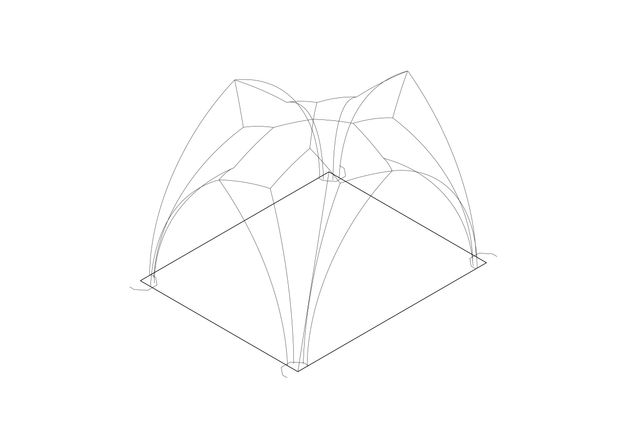Joining the outer ring of bosses across the bay creates the central square and inner ring of bosses (fig. 27). The central saltire is created with diagonals across this square (fig. 28). The height of the central boss, as already stated, is [3.560] metres from the impost and the inner lierne bosses are at the same height as the outer bosses: [3.400] metres. Overlaying the simulated tracing floor on the traced ribs shows the close correspondence between the two (fig. 29). fig. 30 shows the final simulation in 3-D.