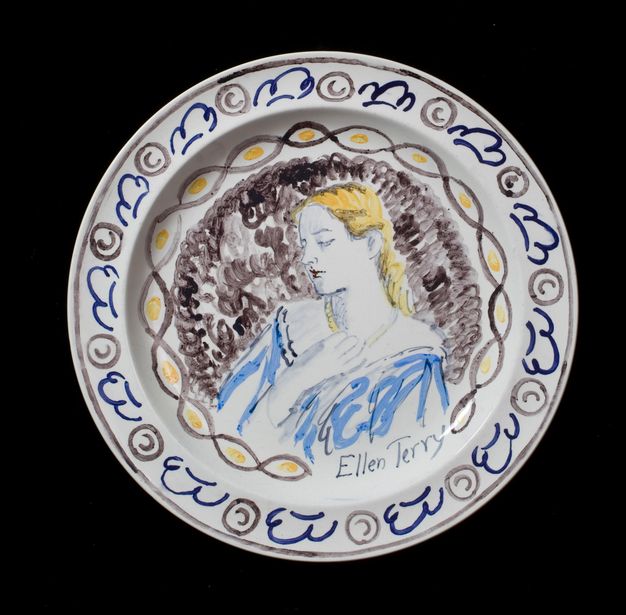 By contrast, manufacturing the Famous Women service necessitated an involved process that took more than a year to organize and complete. It was facilitated by Billy Winkworth, a ceramics collector and connoisseur, who was a mutual friend of the Clarks and the Charleston artists and made introductions to Wedgwood. The artists travelled to Stoke-on-Trent as the guests of Josiah Wedgwood V, where they toured the Etruria factory, and spent a day “looking at all the different shapes, glazes & colours in the Wedgwood pottery.”15 They selected a blank shape called the “concave pattern, that is a plain round plate with a slightly concave edge” for its “very practical” qualities; and a “grey body, which when it has a transparent glaze on it is a lovely cool white very like Delft.”16 Their choices of a fairly chunky shape, similar to those used for Omega ware, with an iconic finish suggests a self-conscious recourse to the history of fine dining combined with an ever-present spirit of subversion—a marriage of tradition and modernism, craft and high art (Figs 5, 6, and 7).