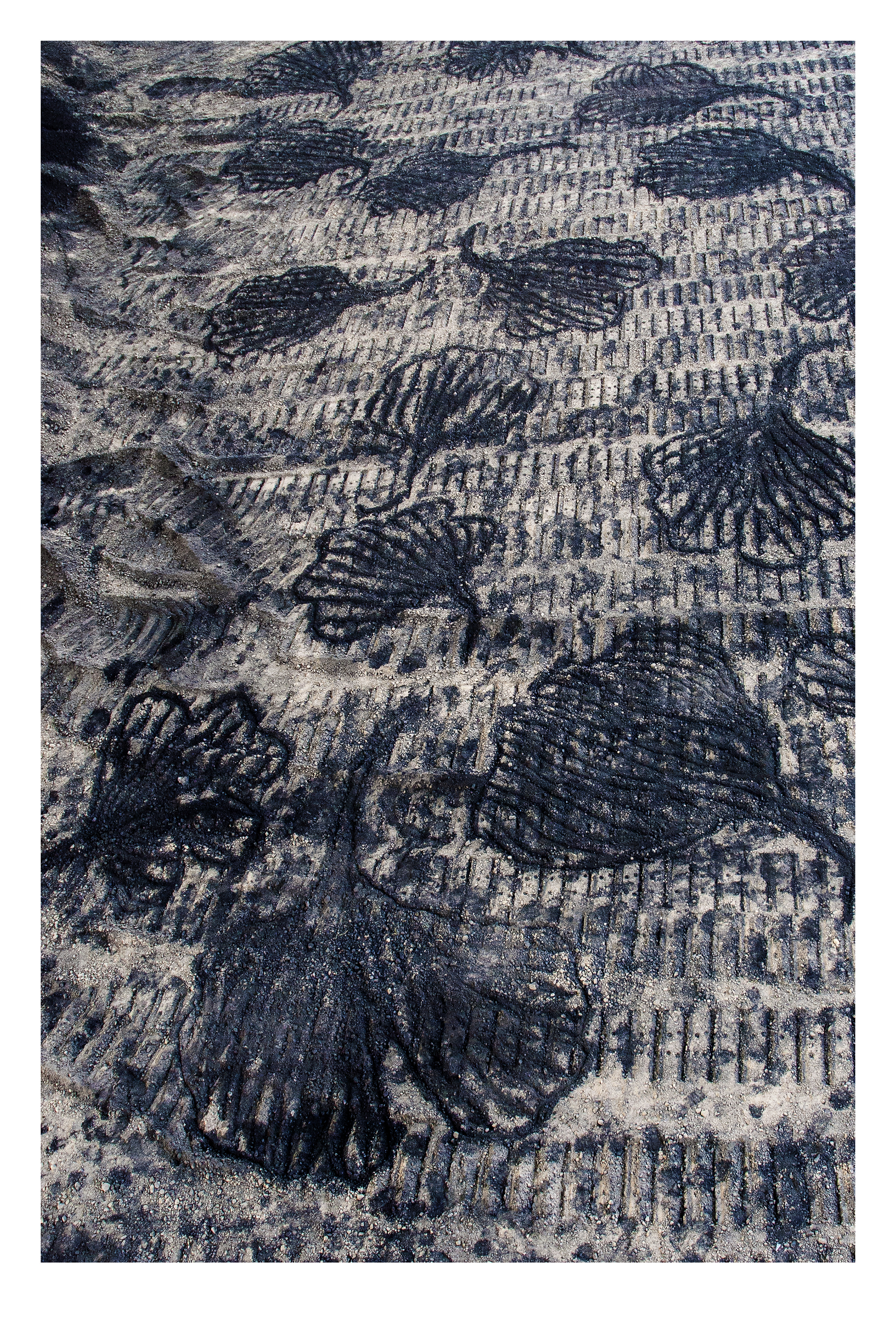 The site of the Pioneer cement factory in Khushab, Pakistan is around 2,000 acres including the on-site quarries, mineral stores, and two kiln runs. Jetlag, no Internet, no cell coverage, and initially no on-site coordination drove me around the site twice daily for much of the first week. These works were brought about on seeing my footprints in the layers of limestone dust over coal, leaving a jet-black transitory inscription upon those mineral histories.