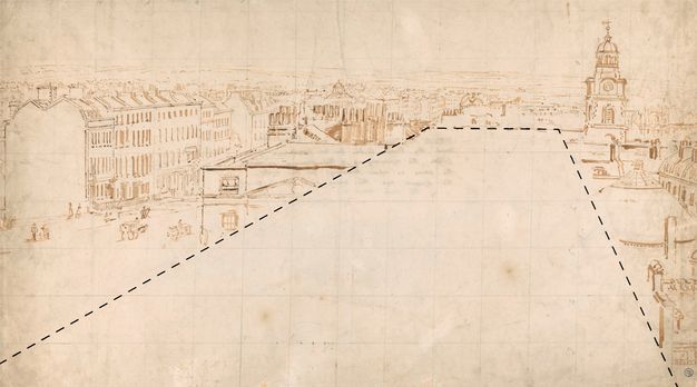 London Bridge and the Tower are particularly poorly served by Girtin’s viewpoint, reduced to a distant blur as a storm hits the City and the bridge is cut abruptly by the modern façade of the Albion Mills (fig. 22). Girtin’s audience would no doubt have found significance in the way that the burnt out industrial mill, commonly thought to be the victim of an arson attack by workers whose livelihood it had threatened, occludes the distant Tower, and indeed, aligns with the still working picturesque mill at Maid Lane (fig. 23).32 Such meaningful juxtapositions were, however, primarily driven by chance and Girtin invariably accepted the strict logic of the panoramic mode, which though it provides good angles for some buildings, creates equally incomprehensible ones for others, often cutting into and occluding forms in arbitrary and disorientating ways. Section Two provides the most startling example of this. Girtin’s viewpoint from the river-end of the roof of Albion Place Terrace, that is opposite to the Albion Mills, may have provided a fine view of St Paul’s, but in the opposite direction the view was dramatically interrupted by an expanse of roof that dwarfed Sir Christopher Wren’s great monument. The blank space in the outline drawing highlighted here (fig. 24), covers the receding length of the roof and four sets of chimneys and this obscures buildings in the vicinity including the Rotunda of the Leverian Museum of Natural Curiosities. The roof was left blank in the drawing because it would not have been possible to paint on the canvas such close objects in an illusory manner and it was almost certainly mocked up instead as a three-dimensional structure, using real tiles and chimneys.33 This was not simply a question of the artful play of illusion and reality, though. The artist and his team had to meet the practical challenge of producing on the canvas, a few metres away from the viewer, a substantial structure which actually extended into their viewing position on the roof—and, by all accounts, the audience was satisfied with the effect. Writers consistently praised the whole as a “triumph of perspective” and one singled out this section for particular praise, noting that the “person who attends” the Eidometropolis had to intervene between two disputing visitors to show that “some earthen chimney-pots”, rather than being “three or four feet long … proved to be no more than six inches!”34