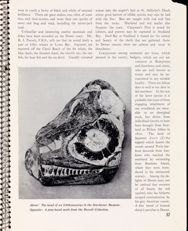 The guide is a vivid encounter with vast, uncanny time and matter whose scale dwarfs that of the human experience. Its cover and endpapers feature astonishing coastal formations and montages created by Nash of fish fossils lifted from Purbeck Limestone, alongside the fossil of a Dapedius, an extinct primitive ray-finned fish, that had been found at Lyme Regis. The images accentuate a marvellous confusion between nature and design. Also featured in the Guide are the patterned head of an adder, the scaled-up form and markings of a pine hawk moth, and a monstrous head of an ichthyosaurus (fig. 18, fig. 19, fig. 20, fig. 21, fig. 22, fig. 23). The Dorset: Shell Guide is replete with the fantastic natural forms of the Jurassic coast: the folded limestone strata of Stair Hole, the implausible land formations of Lulworth Cove, Durdle Door, and Chesil bank, which were in his words, “the result of a mystical judgement called the law of compensation”.35