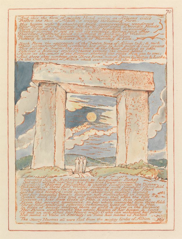 10Images of arches and ogres and canopies reappear through his subsequent art, springing directly from his time among the ancient monuments of the church, but there is also a more fugitive and elusive atmosphere that he recreates in much of his later work. He experienced the coolness and seclusion of “masses of stone in ordered forms” in the nave and the ambulatories, he knew the many rooms of intricate workmanship, the great doors, the narrow passages that seem to lead into the interior darkness of some labyrinth. It was an image of a stone world which Blake was to resurrect in his prophetic verse, at once forbidding, austere and inspiring. His art and poetry are filled with the images of steep steps and ancient doorways, of cloisters and arches and crypts that suggest dissolution and decay but which are also often seen as harbingers of a spiritual world still lying upon the surface of the earth.10