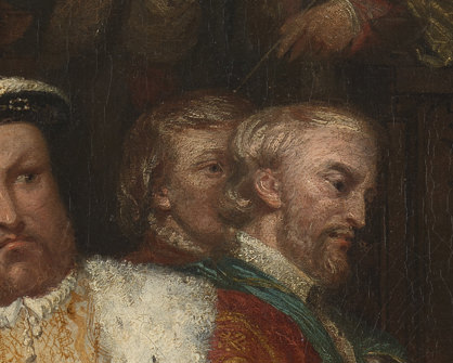Surrounding King Henry VIII are the lords. The diary recorded Sir Thomas Lovel was first introduced on Henry’s left,77 followed by Lord Chamberlain on the balcony,78 then the man in armour,79 and lastly, the man leaning on the gallery talking to Lord Chamberlain.80 Of note due to his absence in the text is the man in profile behind Sir Thomas Lovel, who is the only figure in the painting not specifically identified or mentioned by Monro’s diary (fig. 41).