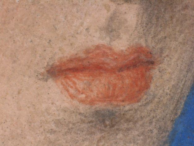 25The artist has laid in a carnation layer of pale pink containing very fine pigment particles. An x-ray of the painting confirms the uses of the two white pigments, utilised to achieve different effects (fig. 8). Lead white was used for the whites of the eyes and as highlights around the features, which show as dense white areas in x-ray. A chalk-based white has been used in the carnation; x-rays penetrate through calcium carbonate, producing darker areas in the x-ray image. Around the eyes are distinctive, short, calligraphic strokes, rendered on a miniature scale (figs. 9 and 10). They help to frame and shape the eyes but they are also carefully and precisely applied. Far from being “thin and transparent”, the artist has successfully captured the three dimensionality of the features, through the controlled and skilful use of the brush. The sense of shape and volume is also captured in the sitter’s lips where the modelling is created not only by using mixtures of paint containing vermilion and lead white but also by the application of the paint and use of individual brushstrokes applied to follow the form of the lips (fig. 11).