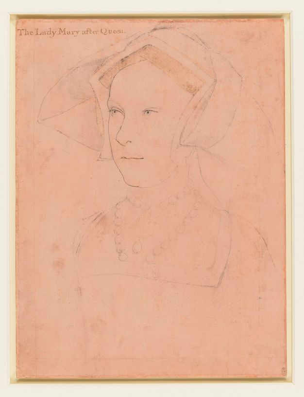 47The early portrait miniature was the prerogative of the inner royal circle, when the Horenbouts were active at court. Combined with the evidence of the dress in the Yale miniature, we can be certain that the lady depicted is of royal status. In recent years, the sitter in the Yale miniature has been identified as Lady Jane Grey.49 However, by the 1550s, when the portrait in question was painted, the wide square neckline was no longer fashionable and had been replaced with closer fitting bodices covering the chest with small collars around the neck. Strong argued that the miniature shows Elizabeth I as a princess, however, the sitter has distinctively pale blue-grey eyes rather than the dark, almost black eyes of Elizabeth, which were commented on during her reign. There is one royal woman at court who would seem to fit the bill: Princess Mary, later Mary I. The red hair and pale blue-grey eyes compare well with other portraits of Mary. The complexion of the sitter is pale with a flush of colouring below the cheekbone. The most compelling trait is the slightly upturned nose, which is seen in many portraits of Mary, including Holbein’s drawing of her (figs. 30, 31, and 32).
