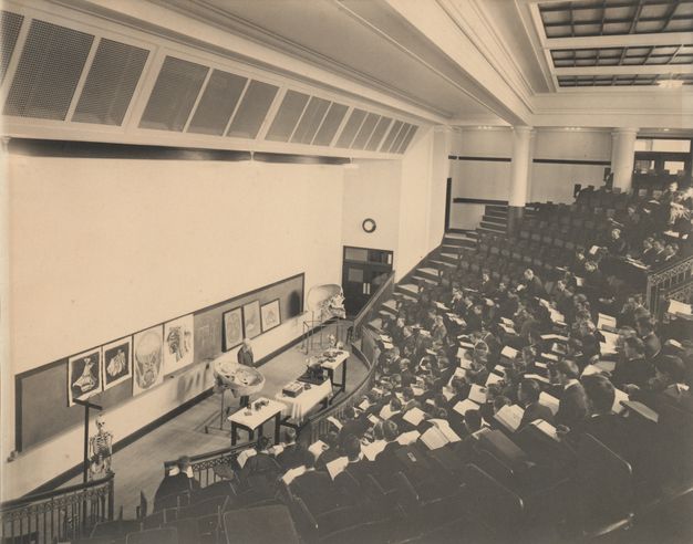 Archival photographs document this practice and make clear that nineteenth-century medical lectures were dynamic events, where lecturers took advantage of myriad methods of visual demonstration. For example, an image from about 1884 of a biology classroom at the University of Pennsylvania shows German chromolithographed wall charts, jarred wet specimens, articulated skeletons, and blackboard drawing (fig. 24).99 Meanwhile, an 1880 catalog for the Louisville Medical College in Kentucky describes how, along with a collection of European papier-mâché models “of the brain, heart, lungs, eye, ear, larynx, large joints, the abdominal and pelvic viscera, the gravid uterus in each month of gestation, with the foetus [sic], membranes, etc.”, they also had “a large number of enlarged colored drawings, anatomical, medical, obstetrical and surgical. For practical teaching, these preparations are of great value to the class.”100 A 1906 photograph of Parkman Professor of Anatomy Thomas Dwight lecturing on anatomy at Harvard Medical School (fig. 25) shows a wide array of materials, including anatomical specimens and models, a skeleton, a Beauchene skull—an exploded skull that is reassembled with moveable parts and can be opened and studied—mammoth paper-mâché sagittal skull, and seven large anatomical illustrations. On the blackboard, Dwight has drawn a skull. Students sit with pencils poised, ready to take notes.