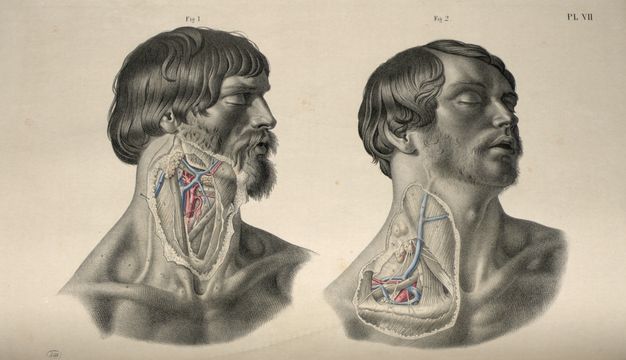 In contrast, considering Plates 9 and 10 (figs. 9 and 10) of the surgical dissection of the sternoclavicular or tracheal region in comparison with Plate IV of the British edition (fig. 11) reveals the linework, in the hair especially, has been softened. The individual almost spontaneous gesture of Maclise’s crayon—which marks out the bristles of sideburn and wiry eyebrow—are smoothed in Sinclair’s adaptation. Most notably, as Keren Hammerschlag explains, the American printing switched out the figure of a Black man for a mirror image of his white companion. This erasure establishes a normative anatomical ideal as white—despite the fact that anatomical study, especially in the United States, relied on the dissection of marginalized persons, including Black subjects.55 Presumably, Sinclair accommodated this modification by making adjustments to the original material himself—and, by the looks of it, he struggled.56 Despite the visual limitations of Sinclair’s pictorial translations vis-à-vis Maclise’s originals, the lithographs for Blanchard and Lea’s edition of Surgical Anatomy are refined, relatively faithful adaptations that utilize subtle hand-coloring to draw the viewer’s attention to relevant anatomical structures.