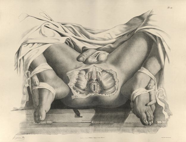 Jacob and Bourgery were acclaimed for the sheer plenitude of materials covered, especially their detailed representation of hands on and in bodies, step-by-step depictions of surgical operations—a genre of illustration that went way beyond anything non-medical artists might attempt in depicting gory scenes of the martyrdom of the saints and historical atrocities, or sexy scenes of nude heroes and woodland nymphs from Greco-Roman antiquity. Their atlas was intended for a specialized readership of medical men who were trained and licensed to look upon difficult subjects, to exercise a privileged gaze. And, by virtue of class and gender, socialized to exercise that privileged gaze upon erotic subjects. Wealthy bibliophilic physicians and surgeons built large libraries of books and, of course, also socialized with non-medical collectors—collectorship and connoisseurship were famously fraternal (but also exclusive). One can easily imagine those non-medical men of privilege, hungry for sensation and novelty, acquiring the atlas of Jacob and Bourgery, eager to peek behind the professional curtain, or merely browsing through volumes in the libraries of medical friends. (The same class of gentlemen used their pull to observe surgeries and dissections, and tour the Parisian morgue.)18