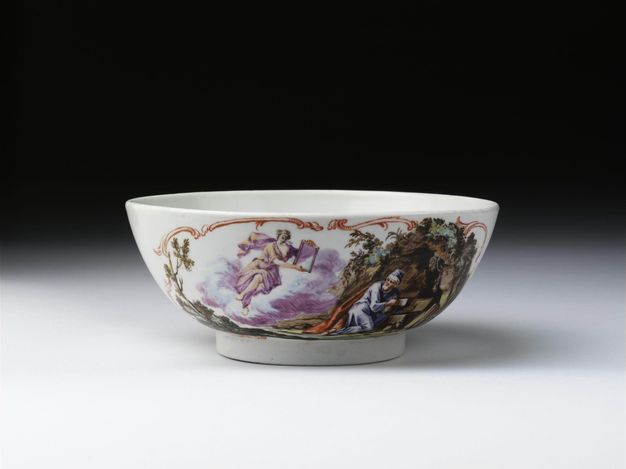 68Between 1744 and 1746, the patentees produced a group of thirty-six porcelain wares with unaker. Now known as the “A-Marked” group, their shared mark is thought to stand for the venture’s financial backer, Alderman George Arnold, a wealthy dry goods merchant.70 These works have been categorized by modern scholars into two groups: stock pattern, which feature chinoiserie enameling similar to that found on blanc de chine porcelain; and high style, many of which are painted by an unknown artist with figure subjects copied from prints by the French illustrator and designer Hubert-François Gravelot, who immigrated to London in 1732.71