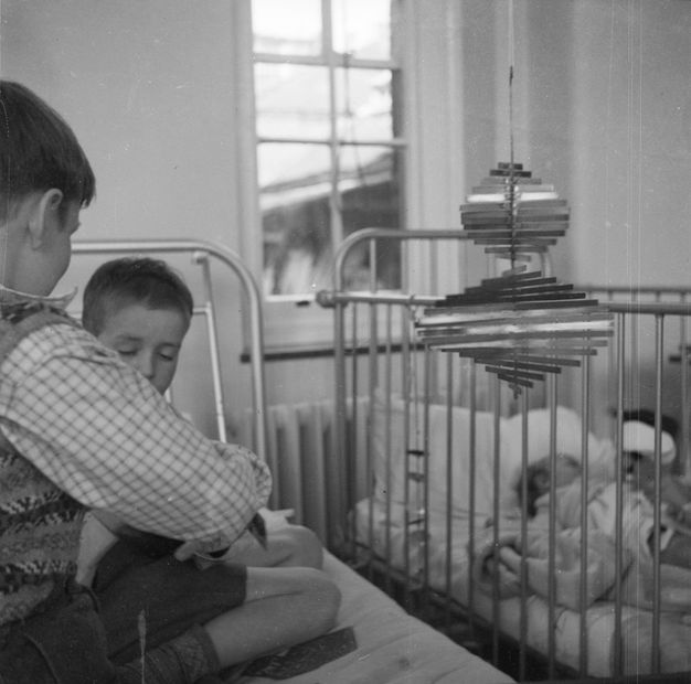 The photographs serve, above all, as a document of the children’s agency and autonomy. Besides the single image of the larger of the two Screw mobiles installed in Ward 17, Henderson made several images of the smaller work (figs. 10–13). The smaller Screw mobile was suspended at the patients’ own level, and the close proximity evidently interested Henderson. The patients could look at the larger mobile or have it demonstrated to them by a member of staff (or, as in the case of the photograph in Nursing Times, by the artist), but they could more directly engage with the smaller mobile: it was within reach; it was a part of the children’s immediate space. And, while these photographs include the smaller Screw mobile, it is the young patients that are—literally and figuratively—the point of focus. Indeed, the camera’s concentrated attention on the child is even more apparent in photographs of them and another work, Mobile, Black and White (1953) (fig. 14). The children are shown being with, rather than necessarily looking at, the mobiles. How the children appear in the space is as, if not more, important than the mobiles themselves. This is not, however, to say that the terms of the images are antithetical to the interests represented in Martin’s work. The relationship between work and “viewer”, and the terms on which that relationship is negotiated, is fundamentally important in Martin’s work.